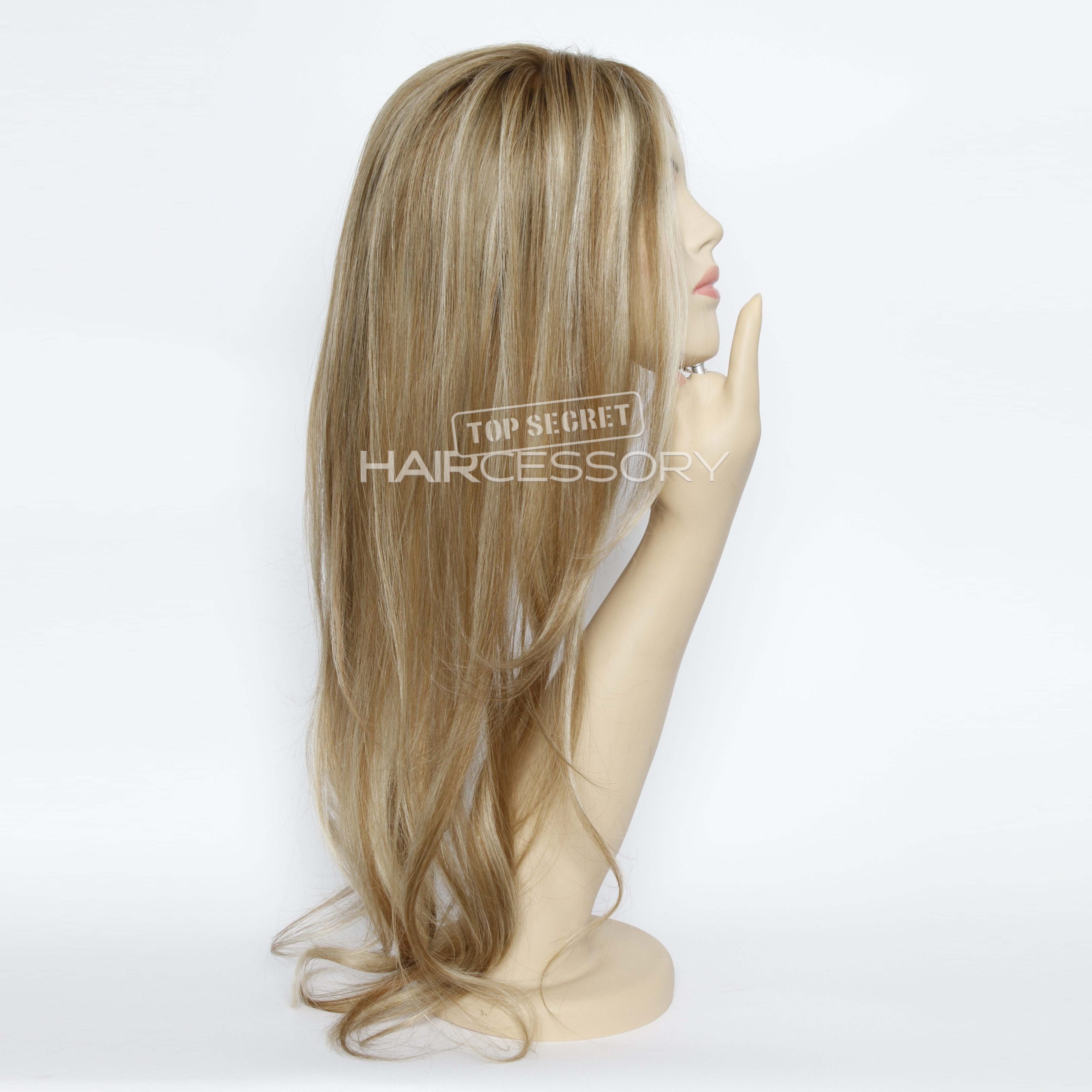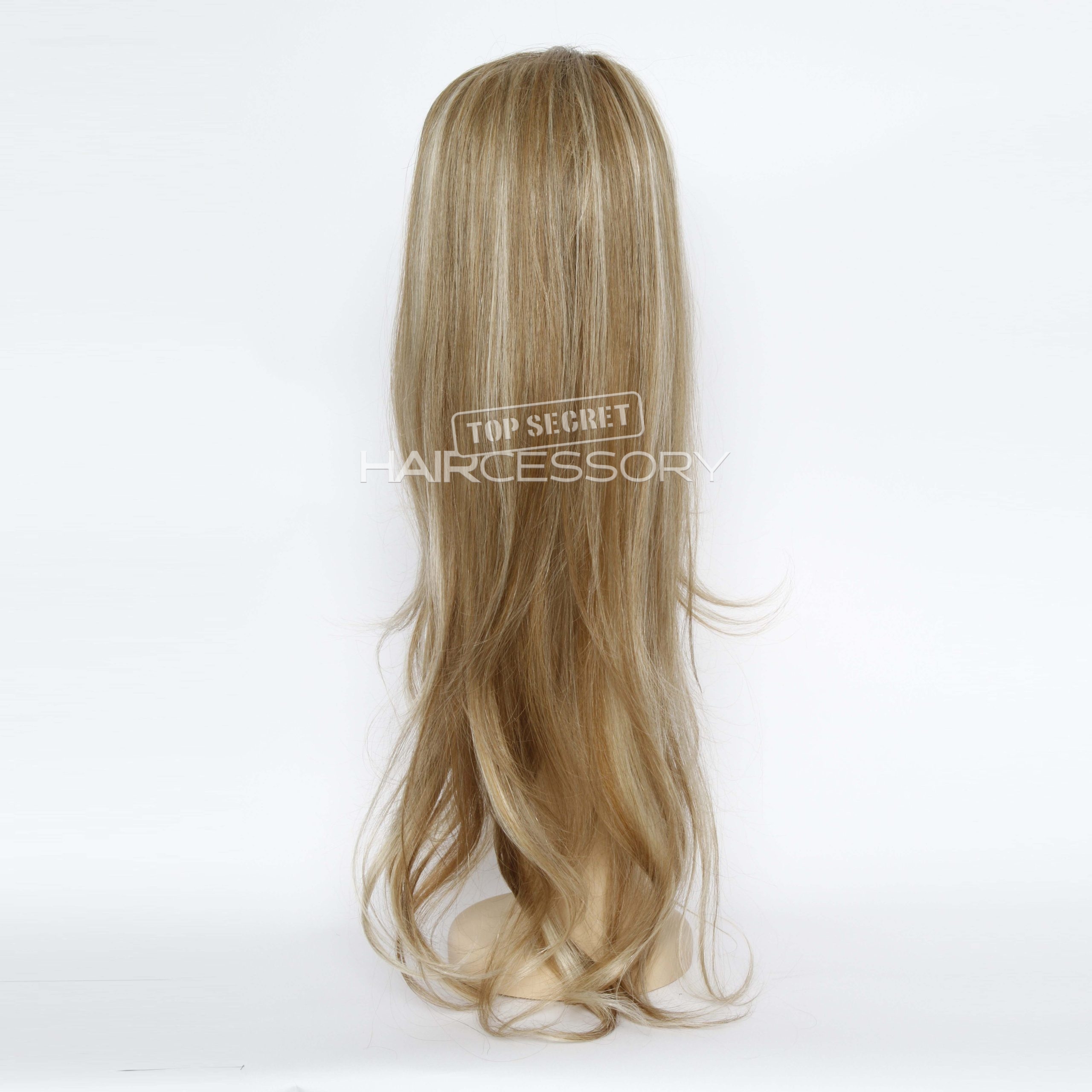 The Top Secret Topper 7″-12″-24″ is our longest layered shag. The base is 6.5″ long by 5″ wide. It is 7″ in the front and angled down on the sides to 24″ in the back. It specifically is designed for those that want volume on top and length in the back with playful layers. Please note that you must have at least 12″-16″ of hair in the back in order for this piece to look good. If your existing hair is short and want to add length and volume with this piece, you must fill in the nape with Extensions.